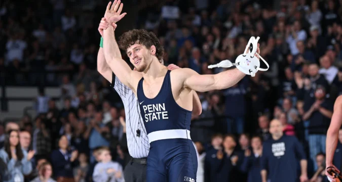 Junior Shayne Van Ness, ranked No. 1 at 149, used four takedowns to control No. 14 Eligh Rivera in a 15-6 major decision. True freshman PJ Duke, ranked No. 4 at 157, put on a takedown clinic against Gavin Hawk. Duke tallied eight takedowns to roll to a 24-8 technical fall at 6:08. Penn State led 22-0 at halftime.