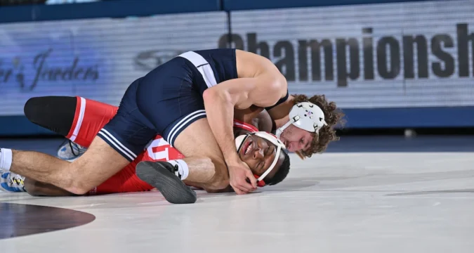 184: Rocco Welsh, ranked No. 1 at 184, faced No. 15 Sam Goin. Welsh forced Goin backwards off the opening whistle as the Hoosier played defense. Welsch countered a Goin shot and took a 3-0 lead at the 1:32 mark with the bout’s first takedown. Goin escaped to a 3-1 score and action resumed in neutral. Welsh used a fast, low single to briefly lift Goin and take him down for a 6-2 lead after cutting him loose. Welsh picked up a stall point, forcing a second stall, and then finished the period with a third takedown to lead 10-2 after one. Goin chose down to start the second period and escaped to a 10-3 lead. Welsh forced the pace for the next minute-plus and blew through a low double to lead 13-3 at the :30 mark. The Nittany Lion sophomore finished the period on top and led 13-3 after two. Welsh chose down to start the third period and escaped to a 14-3 lead. Goin picked up a takedown of his own at 1:40 and cut Welsh’s lead to 14-6. Welsh escaped to 15-6 lead at 1:10. Welsh shot low and Goin countered for a second takedown to cut into Welsh’s lead but the Lion’s early offense was enough in a 15-9 victory.